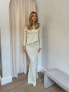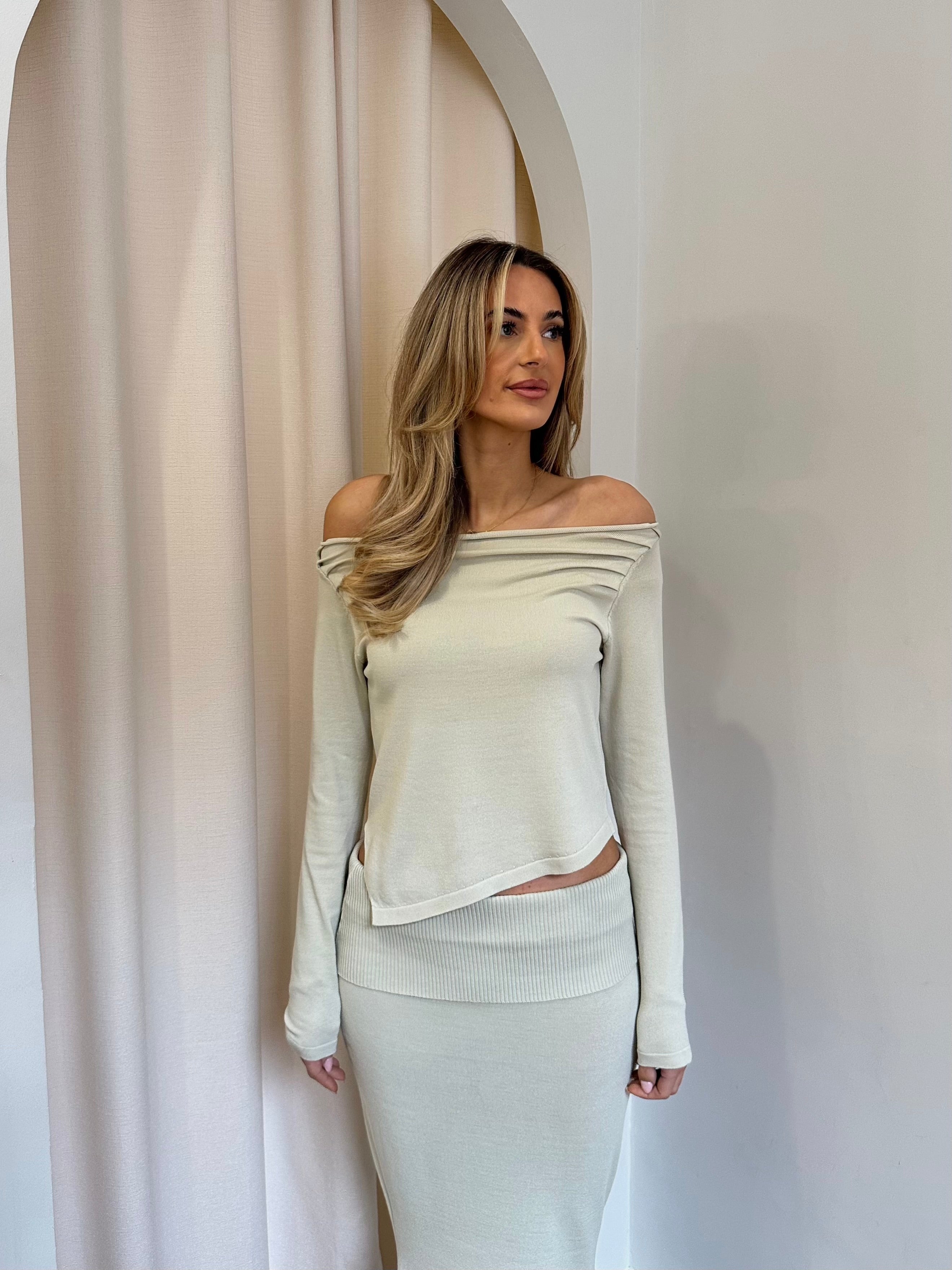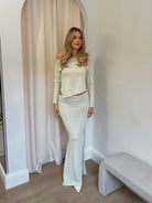 This gorgeous co-ord is made of a gorgeous lightweight soft knit. The top can be worn off the shoulder, and features an asymmetric hem. The skirt features a fold over waistline and a maxi length.